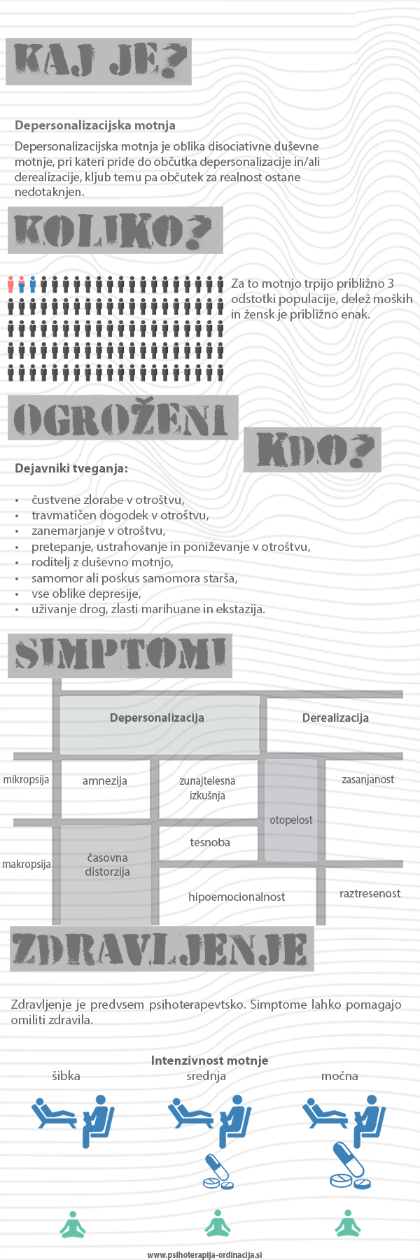 Vztrajna in ponavljajoča se doživetja depersonalizacija in/ali derealizacije, ki jih ni mogoče pojasniti z nevrološkimi motnjami, zlorabo drog in alkohola ali z nedavno hudo travmo.