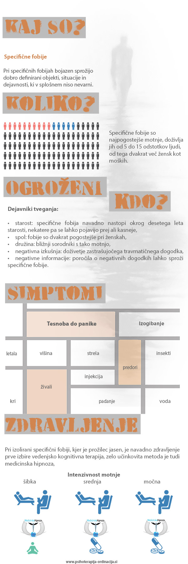 Specifične fobije so najpogostejše motnje, doživlja jih od 5 do 15 odstotkov ljudi, od tega dvakrat več žensk kot moških. Polovica fobij je blagih, tretjina srednje močnih, petina pa zelo močnih.