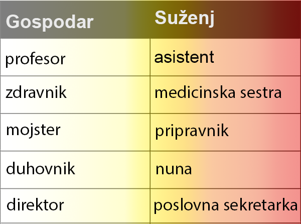 Te stereotipne pozicije so pogosto povsem samoumevne pri nekaterih poklicih in vlogah, kot so: