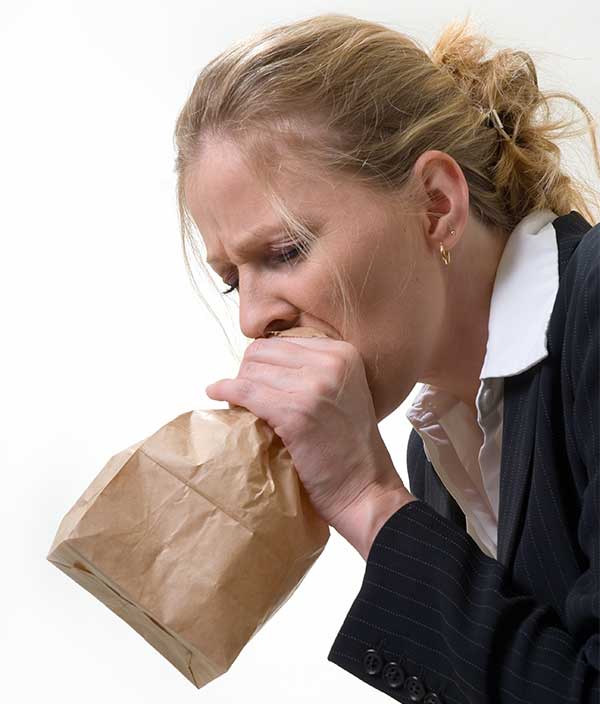 Najprej usmerite pozornost na dihanje. Podaljšujte izdih. Dihajte v naslednjem razmerju: 7-sekundni vdih, 11-sekundni izdih. Telo si med paničnim napadom skuša zagotoviti več kisika, zato nas sili k hiperventilaciji. Če se ne nameravate spopasti z medvedom ali mu uiti na drevo, teh dodatnih zalog kisika ne potrebujete. Če pa se v resnici srečate z medvedom, nikar ne bežite (še najmanj na drevo), saj medved zlahka preseže hitrost 40 kilometrov na uro. Z glasom mirno, vendar odločno opozorite nase in se umaknite v smeri prihoda. Hiperventilacija povečuje parcialni tlak kisika v krvi in s tem ovira normalen ritem dihanja, nastopijo pa tudi drugi neprijetni pojavi, zlasti vrtoglavica. Medtem ko usmerjate pozornost na dihanje, v mislih štejte sekunde tako, da z običajno hitrostjo izgovarjate 21, 22, 23 …