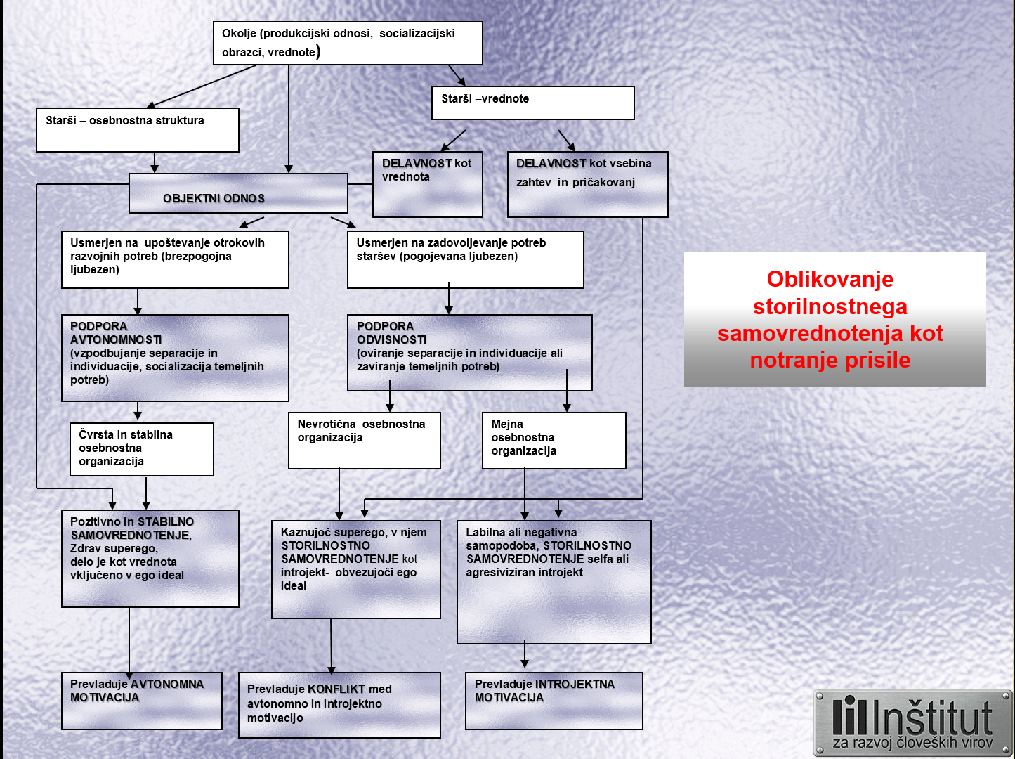 Odnos, ki omogoča ustrezno zadovoljevanje otrokovih razvojnih potreb in podpira njegovo avtonomnost, otroku pomaga čustveno dozoreti ter oblikovati čvrsto in stabilno osebnostno organizacijo, v nasprotnem primeru pa se lahko oblikuje nevrotična osebnostna organizacija ali mejna osebnostna organizacija. Del čvrste in stabilne osebnostne organizacije sta tudi pozitivno in stabilno samovrednotenje ter ustrezen kontrolni mehanizem (nadjaz); delavnost je vrednota v okviru ego ideala. Pri tej osebnostni strukturi prevladuje avtonomna motivacija, ki izhaja iz pristnih potreb.