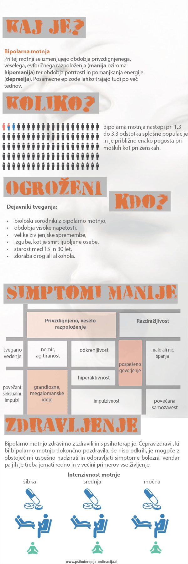 · občasna daljša obdobja vzhičenega, ekspanzivnega ali razdražljivega razpoloženja, ki traja najmanj štiri dni in se razvidno razlikuje od običajnega slabega razpoloženja,